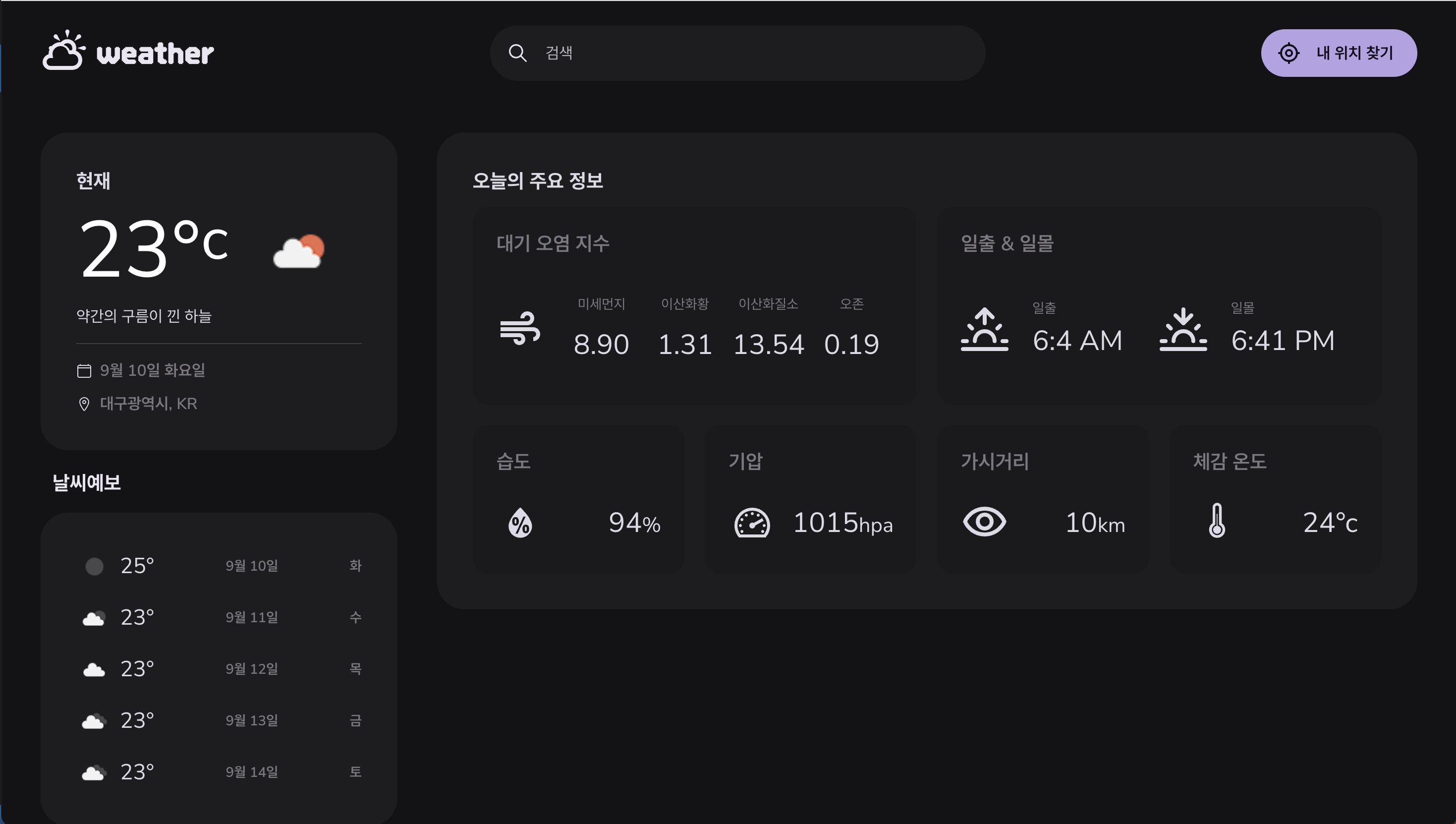 기존의 날씨 정보도 함께 구성하여 오늘의 주요 정보 섹션을 만들었습니다.
